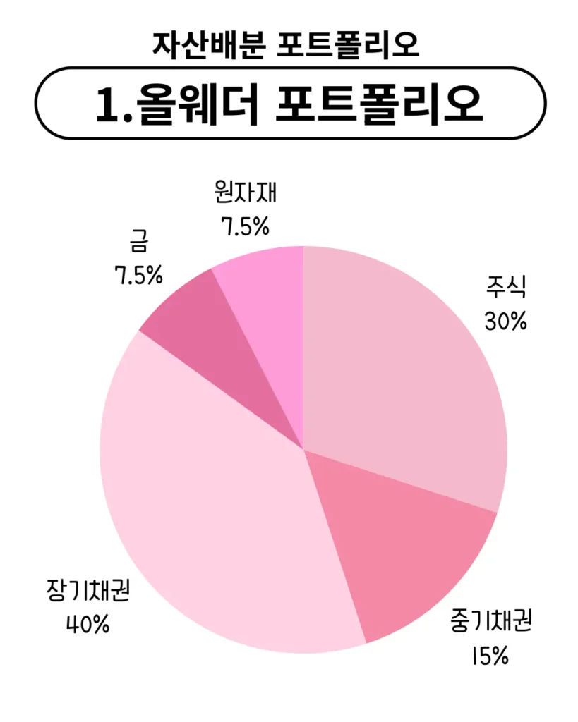 브리지워터 창업자 레이 달리오가 만든 포트폴리오입니다. 경제 상황을 예측하지 말고 모든 상황에 대비할 수 있도록 만들어졌고요.