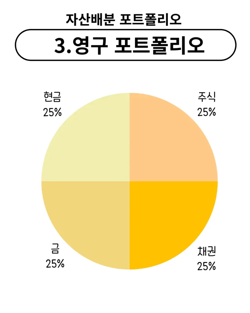 경제학자 해리 브라운이 만들었으며, ‘어떤 경제 환경에서도 살아남는 포트폴리오’라고 해서 영구 포트폴리오라고 불립니다.