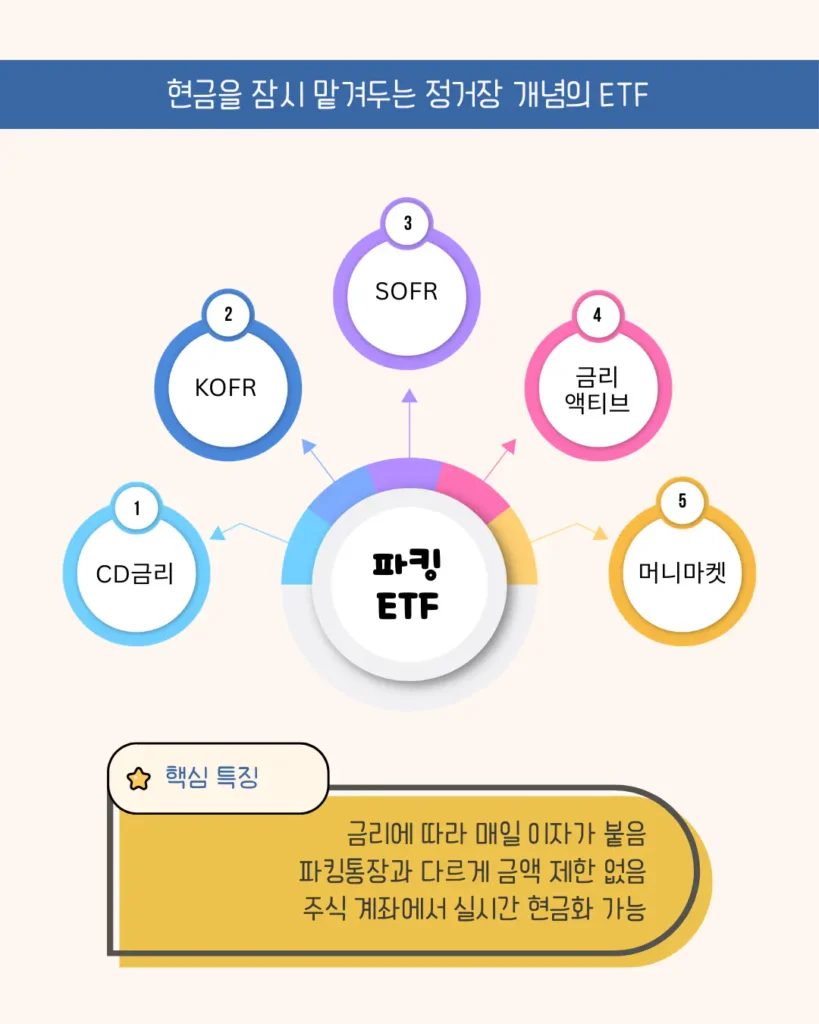 파킹 ETF는 지금까지 언급한 ETF 중 가장 ‘현금’에 가까운 상품입니다. 보통 투자 대기 자금으로 파킹 ETF를 사놓는 경우가 많은데요.