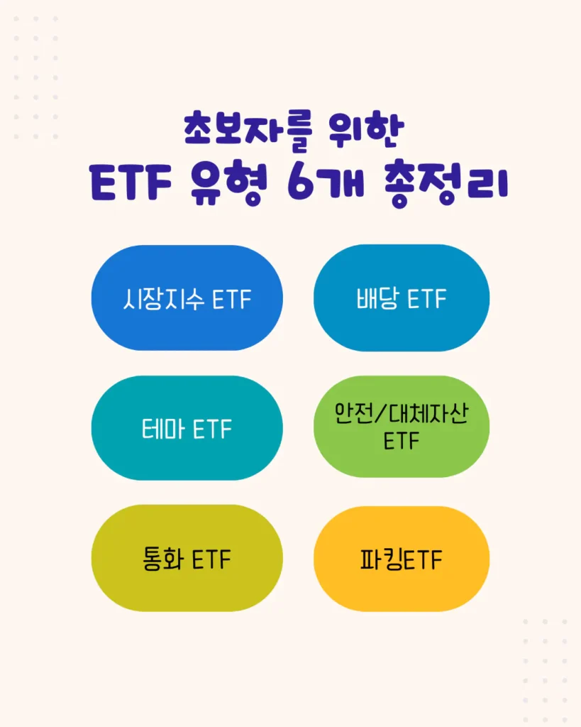 ETF 유형은 크게 6가지로 나눌 수 있습니다.