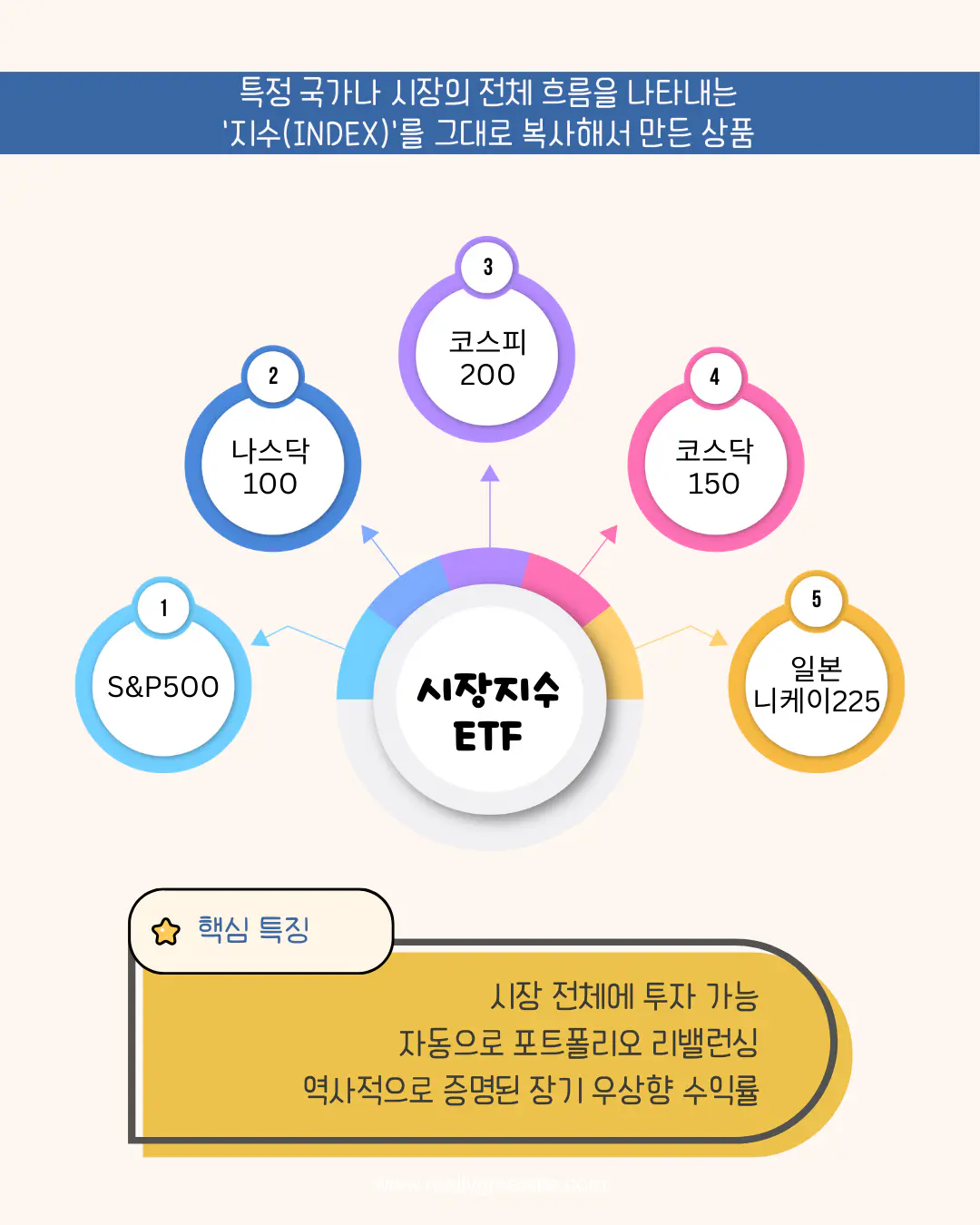 시장지수 ETF는 한 마디로 ‘특정 국가나 시장의 전체 성적표를 그대로 사는 투자’입니다. 개별 기업을 하나하나 분석해서 고르는 대신, 시장의 평균 수익을 목표로 하는 가장 정석적이고 기초적인 투자 방법이에요.