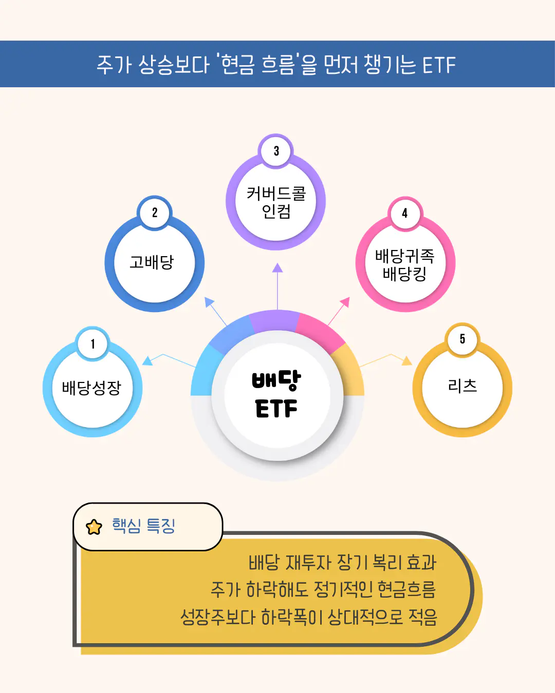 배당 ETF는 말그대로 주가 상승 수익뿐만 아니라, 보유만 해도 통장에 현금이 꽂히는 ‘현금 흐름(Cash Flow)’에 최적화된 EF입니다.