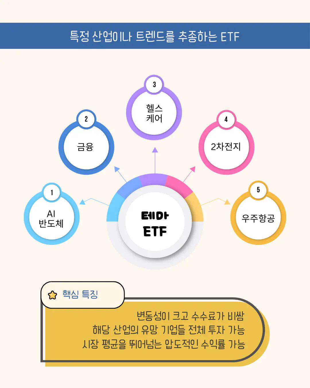 테마 ETF는 특정 국가나 지수가 아니라 인공지능(AI), 반도체, 금융, 소비재, 2차전지, 우주항공처럼 특정 산업군이나 비슷한 트렌드의 기업들만 쏙쏙 골라 담은 바구니라고 생각하시면 됩니다.