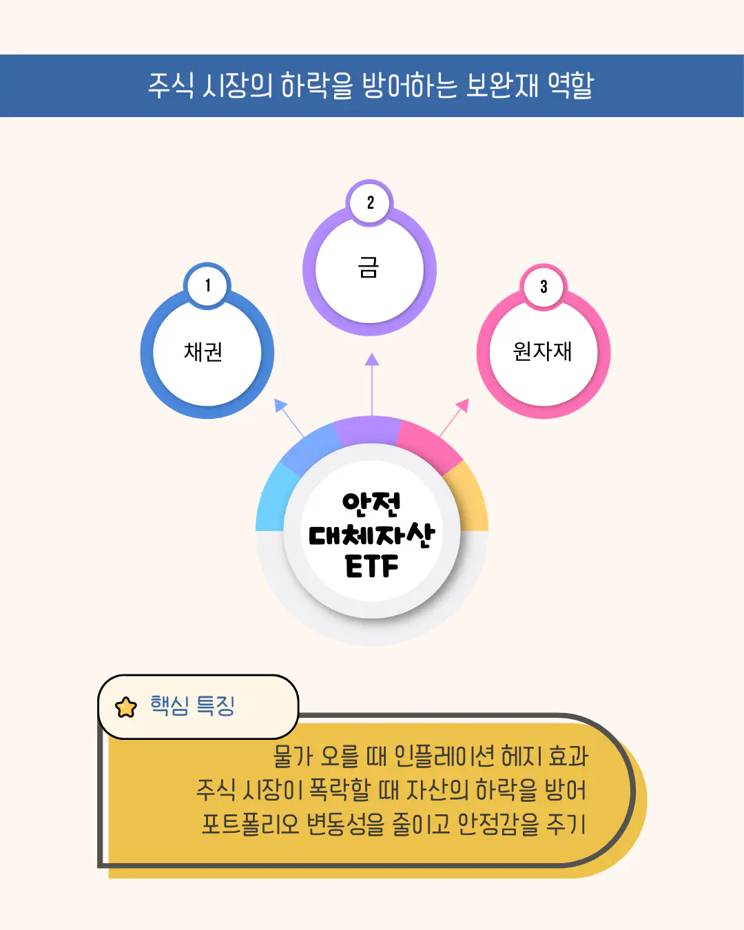 안전/대체자산 ETF는 주식 시장이 흔들릴 때 내 계좌를 든든하게 지켜주는 ‘방패’ 같은 존재입니다. 주식과 반대로 움직이거나 상관관계가 낮은 자산들로 구성됩니다.