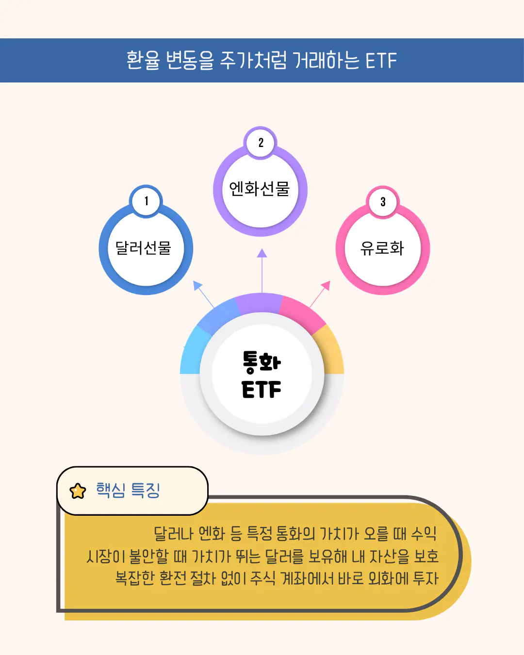 통화 ETF는 주식이나 채권이 아닌 ‘외화(주로 달러)의 가치’에 직접 투자하는 상품입니다. 환율 변동을 이용해 수익을 내거나, 원화 가치 하락에 대비하는 방어 수단으로 활용됩니다.