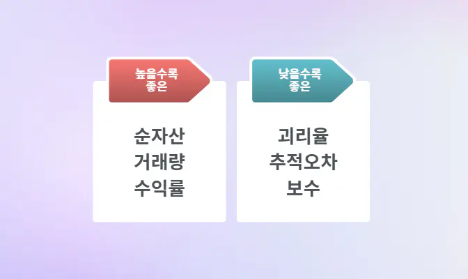 - 낮을수록 좋은 것→ 괴리율, 추적오차, 보수