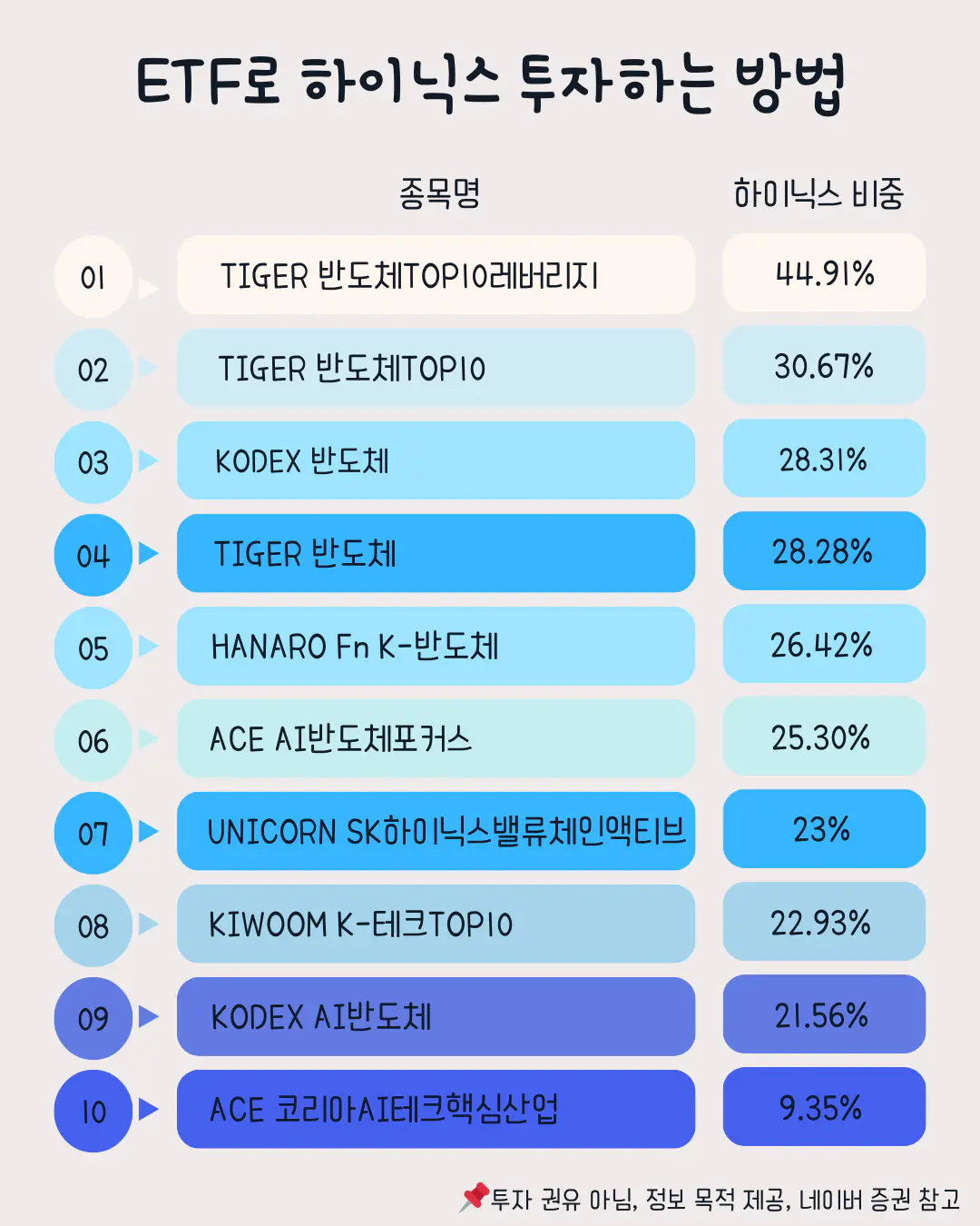 • 삼성전자 희석 효과: 대부분의 TOP 10 ETF는 삼성전자 비중도 큽니다. 하이닉스만 독주할 때는 직접 투자보다 수익률이 낮을 수 있습니다.